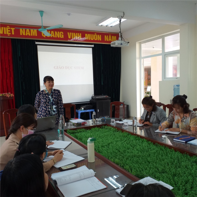 Tại buổi tập huấn, cô giáo đã giúp đội ngũ giáo viên nhà trường hiểu được thế nào là dạy học theo phương pháp STEM, những nội dung, cách thức để dạy trẻ theo phương pháp STEM. Trong buổi tập huấn, giáo viên nhà trường đã được tiếp cận cách học mới hiện đại, linh hoạt hơn. Buổi học diễn ra nhẹ nhàng, lí thú qua sự truyền đạt hết mình của cô giáo.