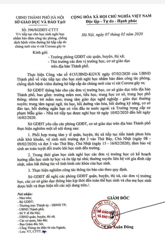 Theo thông báo mới nhất của Sở giáo dục và đào tạo Hà Nội về việc nghỉ phòng dịch viêm đường hô hấp cấp do virus Corona gây nên, học sinh trên địa bàn Hà Nội tiếp tục nghỉ 1 tuần từ 10 tháng 2 năm 2020 đến hết ngày 16 tháng 2 năm 2020.